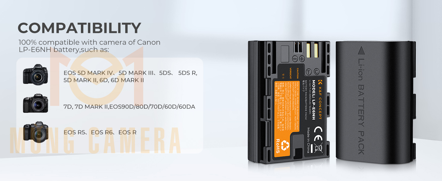 - * Khả năng tương thích rộng. Tương thích với máy ảnh Canon sử dụng pin LP-E6NH/LP-E6N/LP-E6, chẳng hạn như Canon EOS R5, EOS R6, EOS R, EOS 5D Mark IV, 5D Mark III, 5DS, 5DS R, 5D Mark II, 6D, 6D Mark II, 7D, 7D Mark II, 90D, 80D, 70D, 60D, 60Da.