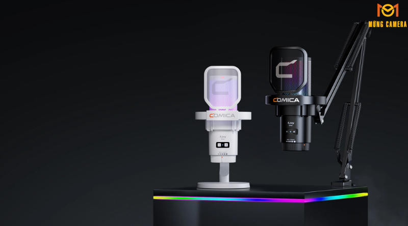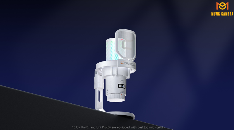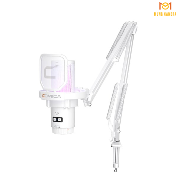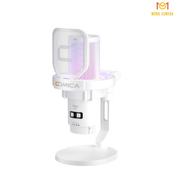 Đèn RGB trên Comica EJoy Uni (A)-White có thể thay đổi màu sắc theo sở thích hoặc trạng thái micro, tạo điểm nhấn thẩm mỹ cho setup streaming hoặc học online.