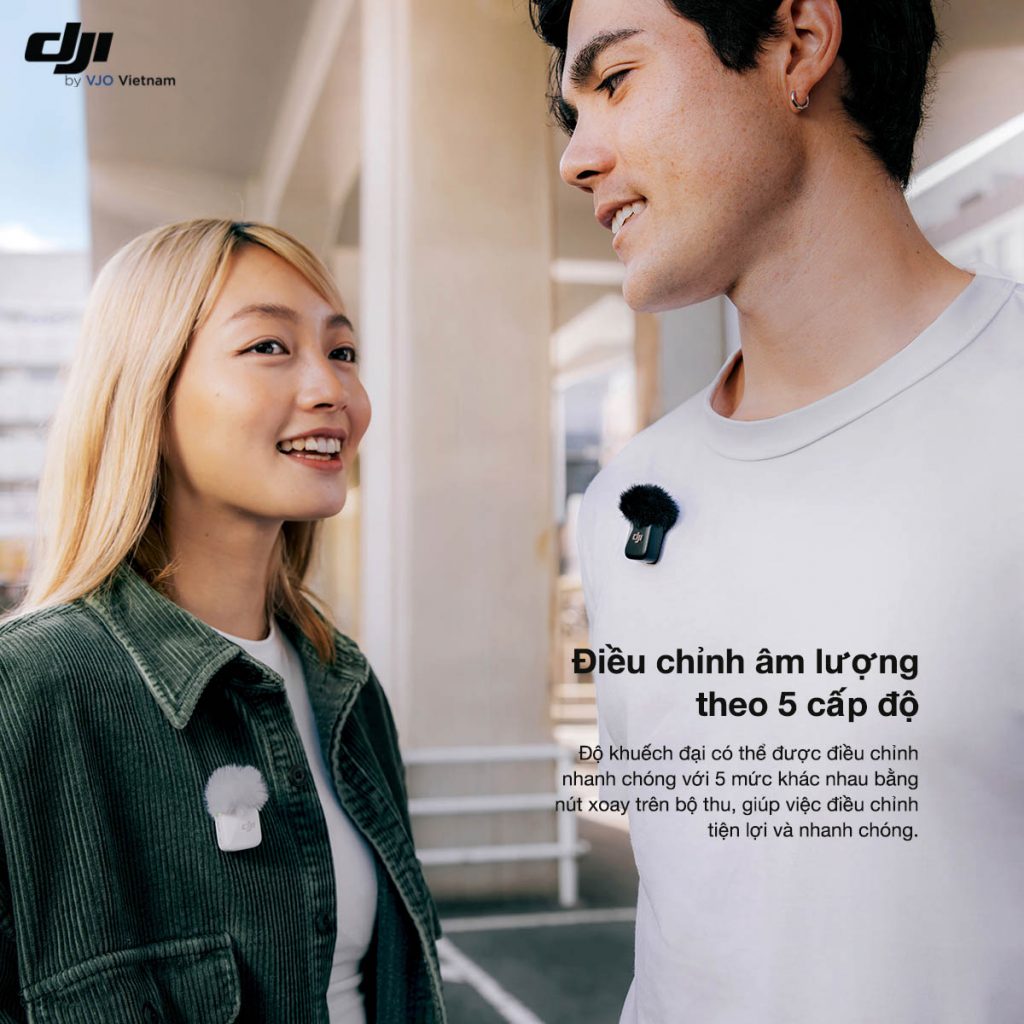 DJI Mic Mini tích hợp núm xoay với 5 mức khuếch đại, cho phép người dùng điều chỉnh âm thanh dễ dàng theo từng tình huống.
