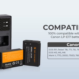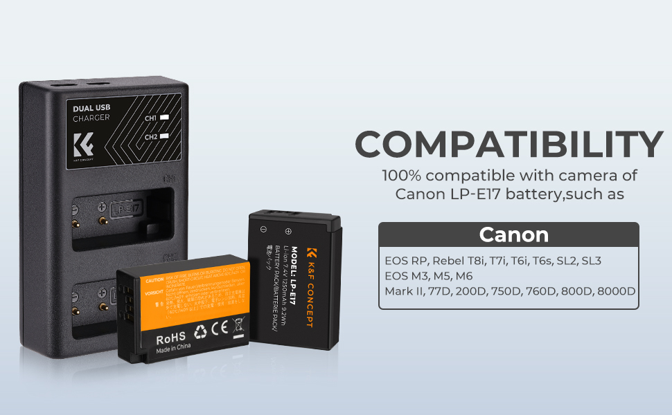 * [Khả năng tương thích] [Quốc gia vận chuyển: Mỹ/Anh/Canada/EU. Các quốc gia khác không thể giao hàng và đã ngừng bán.】 Pin Canon LP-E17 của K&F CONCEPT tương thích với các máy ảnh Canon sử dụng pin LP-E17 như Canon EOS RP, Rebel T8i, T7i, T6i, T6s, SL2, SL3, EOS M3 , M5, M6 Mark II, 77D, 200D, 750D, 760D, 800D, 800D, 8000D, v.v. 8000D, v.v. Pin hoạt động bình thường trong máy ảnh như nguyên bản nhưng không hiển thị mức năng lượng. (Lưu ý: Trên đây chỉ là một phần danh sách các mẫu)